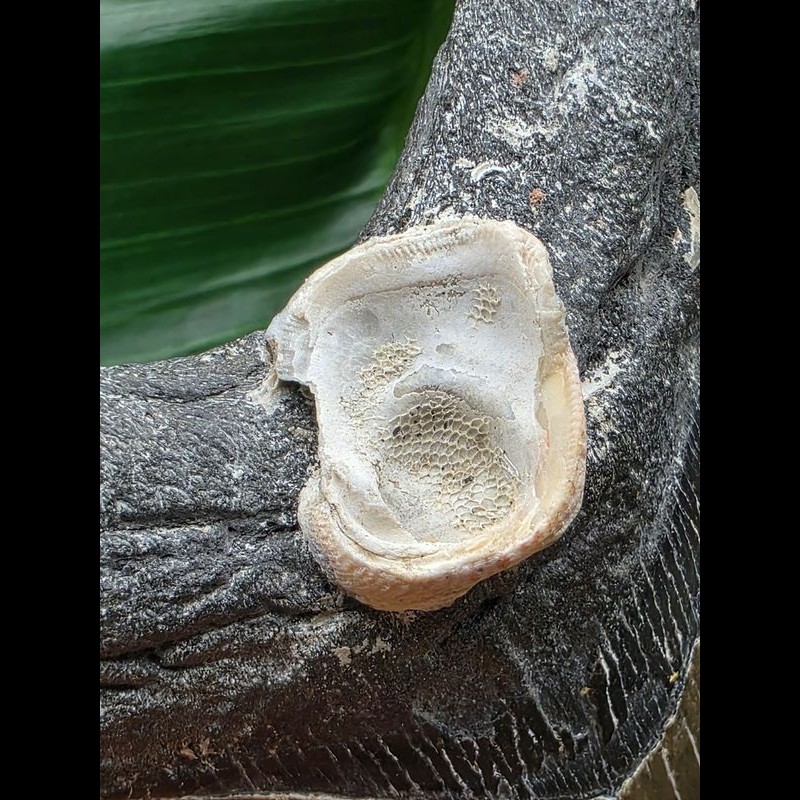 Der 10,4 c große Zahn des Carcharocles Megalodon besitzt einen graubraunen glänzenden Zahnschmelz. Die schmal zulaufende Zahnkrone ist leicht gebogen. Die feine Zahnung ist schön erhalten und teilweise scharf. Die schmale Bourlette ist schwarz und nahezu vollständig erkennbar. Die graue Zahnwurzel wurde über die vielen Millionen Jahre im Meer leicht abgetragen und es ist noch ein weißer Muschelrest anhaftend, was den Zahn sehr speziell macht.
