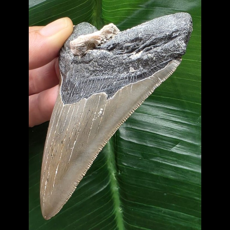 11,3 cm Zahn des Megalodon mit wuchtiger Wurzel DDer 11,3 cm fossile Zahn des Carcharocles Megalod..